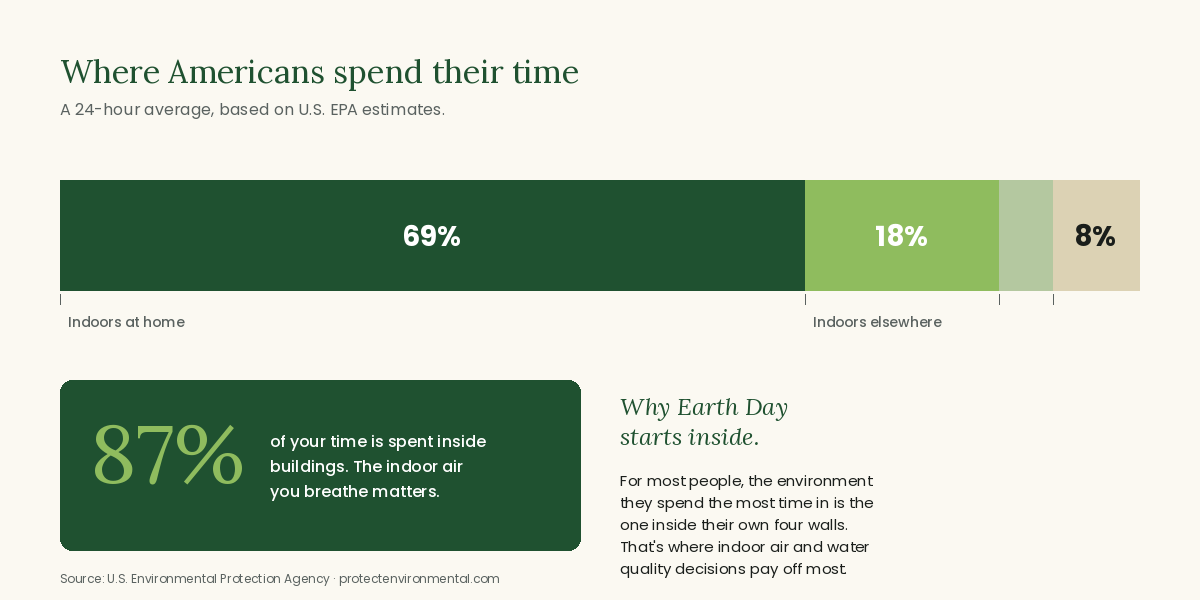 Earth Day usually brings to mind forests, oceans, and carbon emissions. All of that matters. But for most people, the environment they spend the most time in is the one inside their own four walls. The U.S. EPA estimates that Americans spend roughly 90% of their time indoors, which means the air you breathe at home has a far bigger day-to-day impact on your health than the air outside.