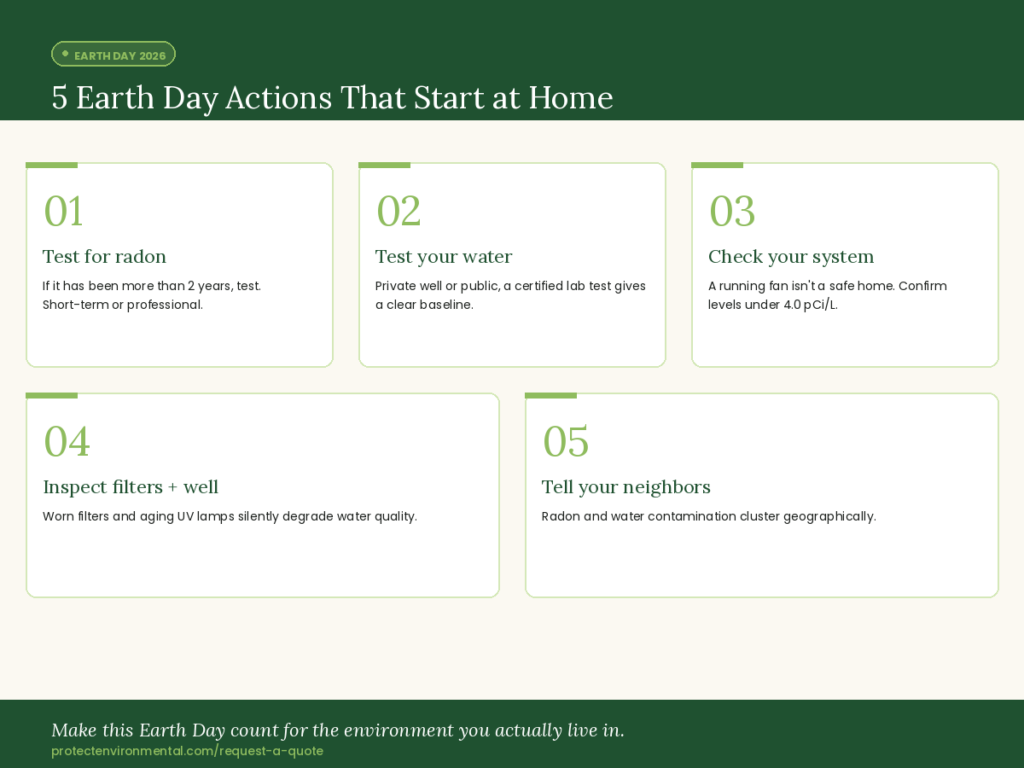 At Protect Environmental, we see this every day. Families learn that their house has elevated radon months after moving in. Homeowners with private wells discover levels of arsenic, uranium, or bacteria they had no idea were there. Most of these issues never show up without a test, because you cannot see, smell, or taste them. Earth Day is a good reminder to look.