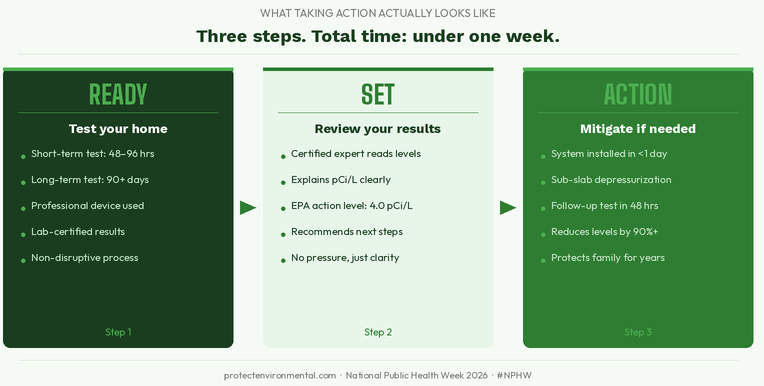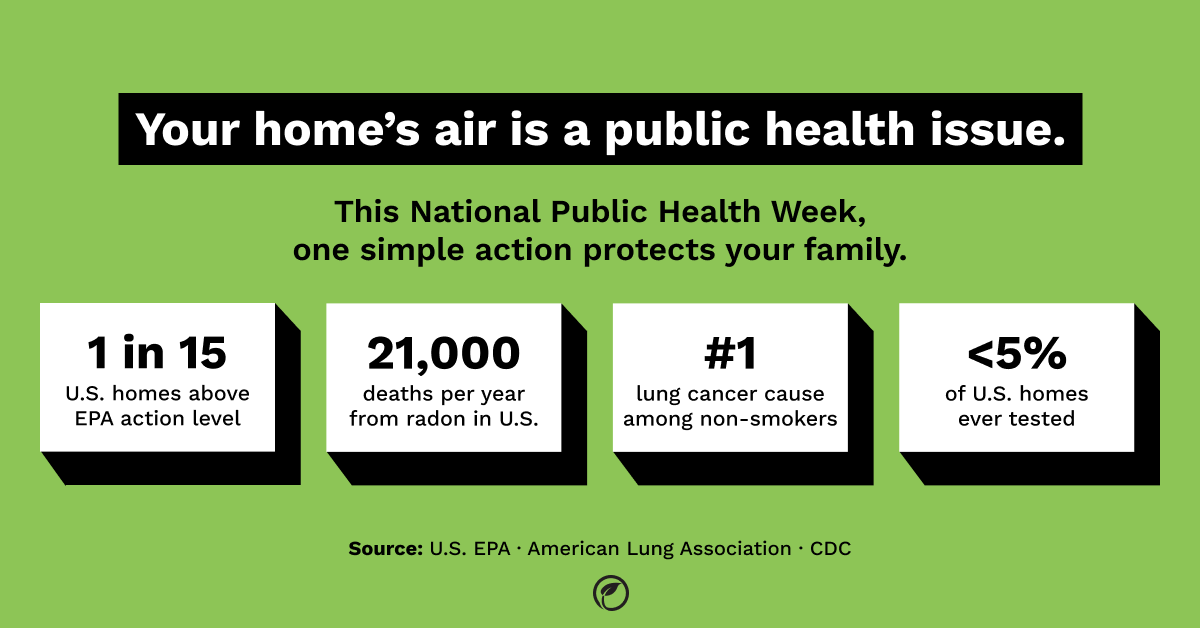 National Public Health Week 2026 runs April 6-12 under the theme “Ready. Set. Action.” One of the most preventable public health threats in American homes is radon, a colorless, odorless radioactive gas that causes more than 21,000 deaths per year. Testing and mitigation are proven, accessible, and can protect any home.